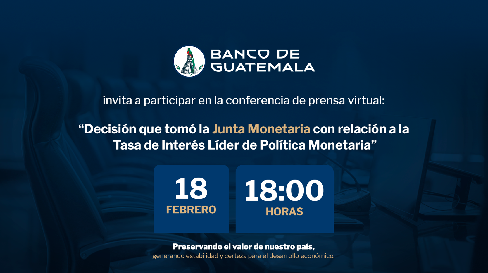 El miércoles 18 de febrero a las 18:00 horas, la Junta Monetaria dará a conocer la decisión adoptada respecto a la Tasa de Interés Líder de Política Monetaria. Sigue la transmisión en vivo a través de los canales oficiales en redes sociales.